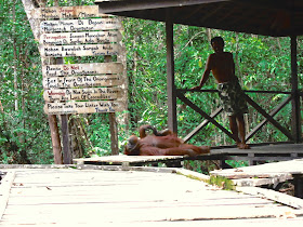 Apparently Siswi is one of the first offspring of a rehabilitated orangutan back in the '70s when Camp Leakey was founded (and, omg, we share the same birthday, although she's a year older!). She had a disease in the past that rendered her sterile, so she is one of the few females in the park without a child. She's free to come and go from the camp into the forest, but she's very social and likes to hang out with the forest rangers in their camp, on the dock, in the river by the boats... it helps that the boat crews throw her food scraps (see below):